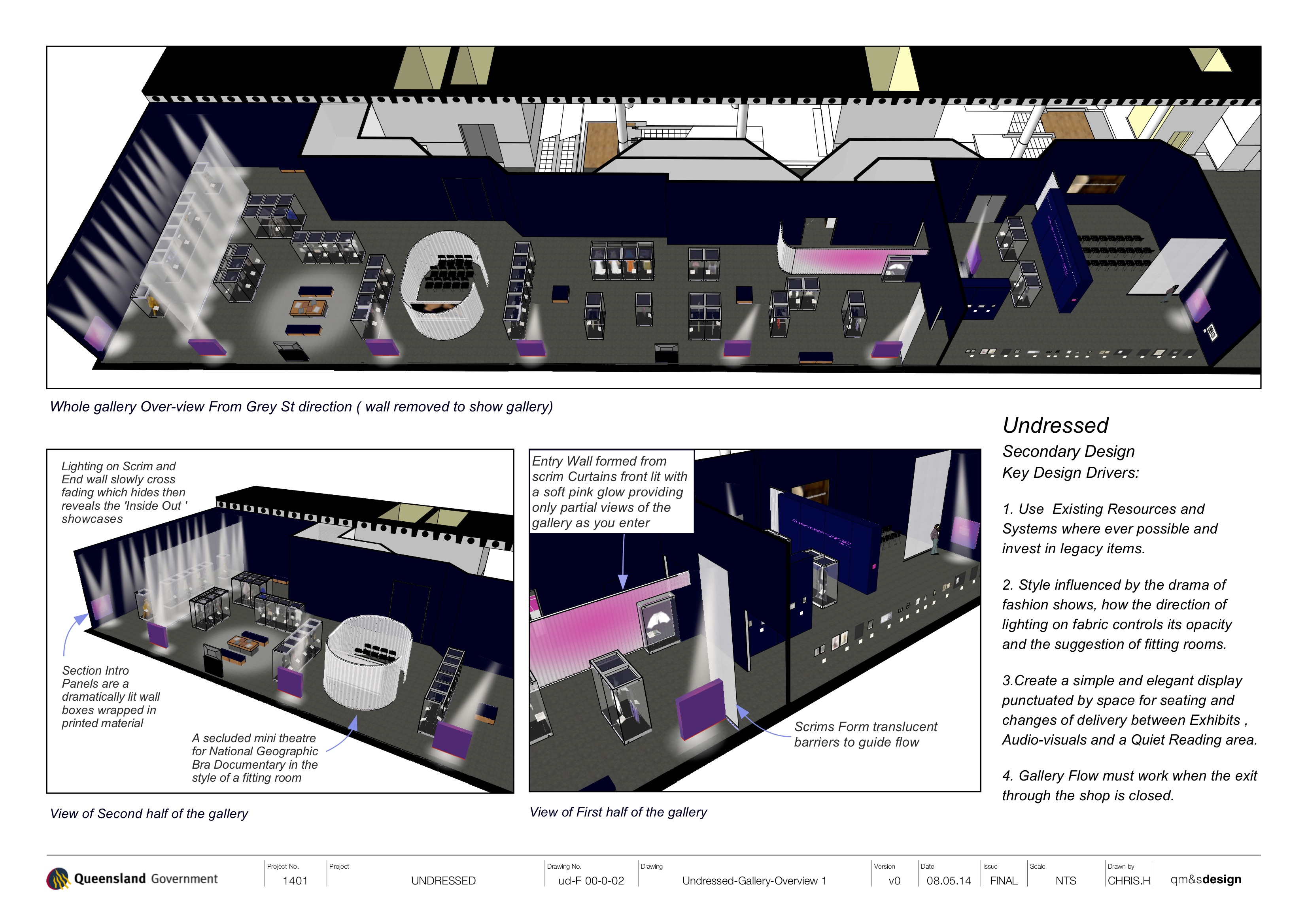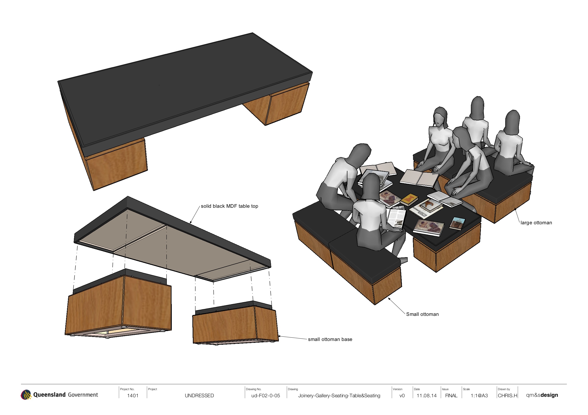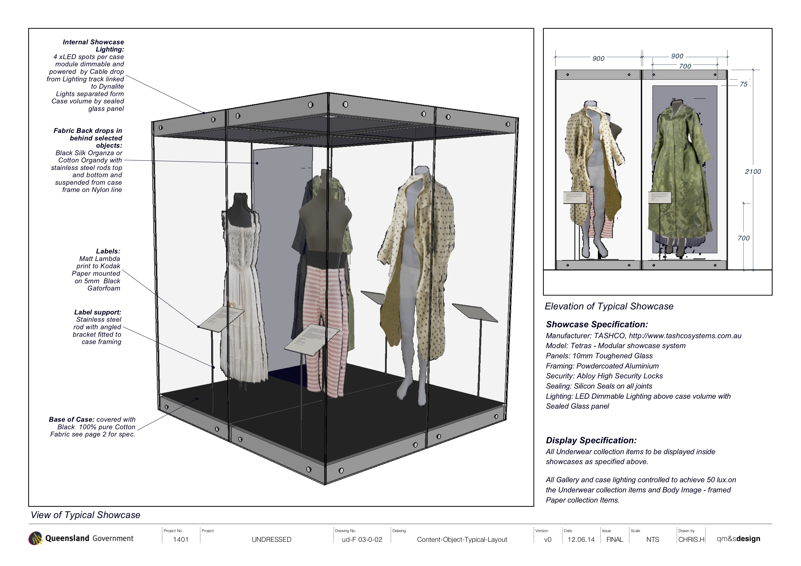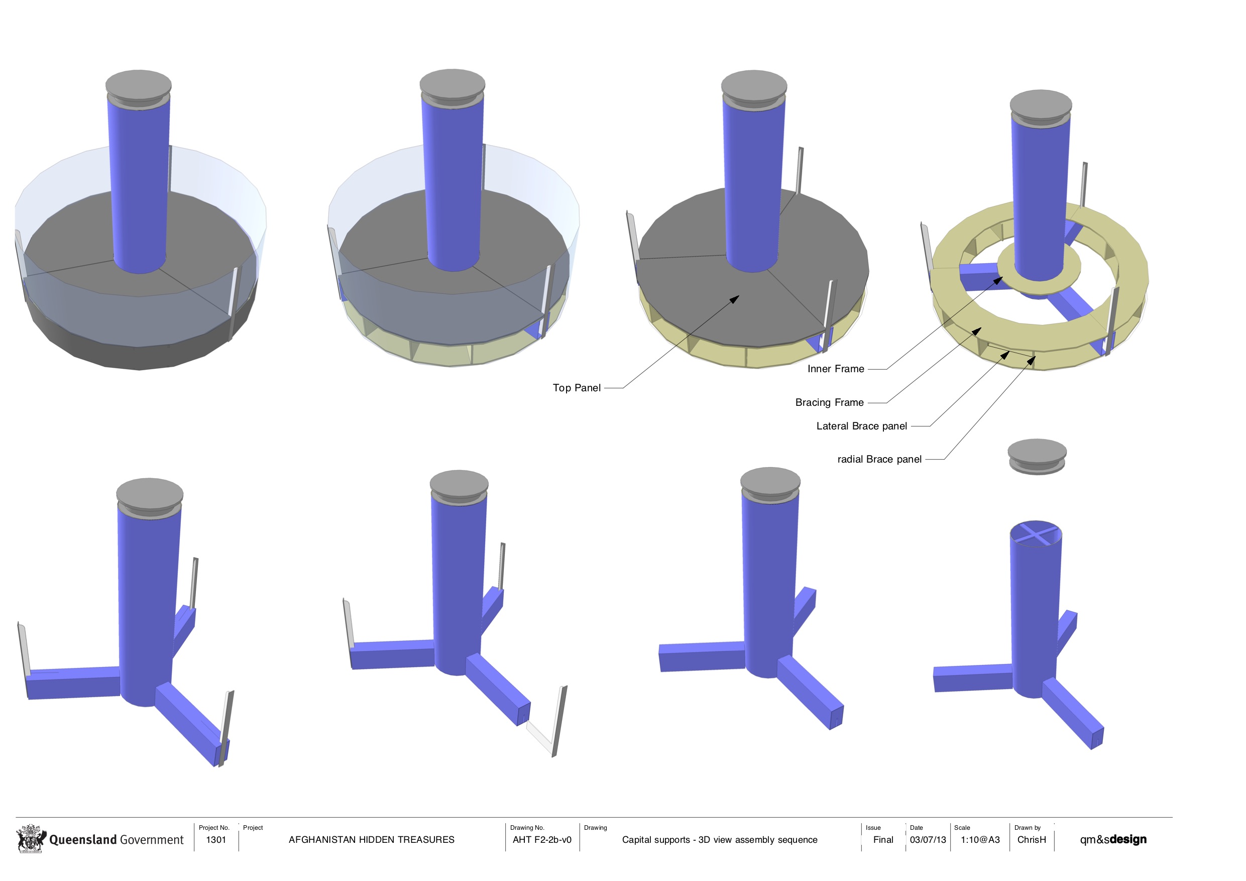 Detailed design development of exhibition layouts, custom showcases, object supports, seating and other exhibition components.